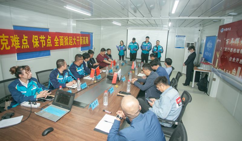 在“學黨史”環(huán)節(jié),通過“身臨其境學黨課”的方式講述了“選址西柏坡,新中國從這里走來”,緬懷革命先輩,不忘革命初心;項目青年團朗誦詩歌《西柏坡精神頌》,展現(xiàn)項目青年員工積極向上、向黨靠攏的精神風貌。在“悟思想”環(huán)節(jié),項目管理人員上臺宣誓,承諾在工作、生活中積極踐行“西柏坡精神”,建設人民滿意工程,造福滄州百姓;業(yè)主及項目管理人員在“抓重點、克難點、保節(jié)點,全面掀起大干新高潮”條幅上簽字承諾。在“辦實事”環(huán)節(jié),項目經(jīng)理向青年突擊隊授旗,提高項目青年員工責任擔當意識,為項目各項工作開展提供強勁動力;項目黨員干部、青年突擊隊隊員與協(xié)力隊伍人員及當?shù)鼐用窠Y(jié)對幫扶,并發(fā)放志愿服務卡,全力以赴幫助他們解決生活、工作中遇到的問題。在“開新局”環(huán)節(jié),項目工程經(jīng)理帶領(lǐng)與會人員參觀施工現(xiàn)場,介紹項目的工程概況、工程重難點,以及建設過程中的感人故事,讓與會人員感受企業(yè)的綜合實力以及建設人民滿意工程的決心和信心。